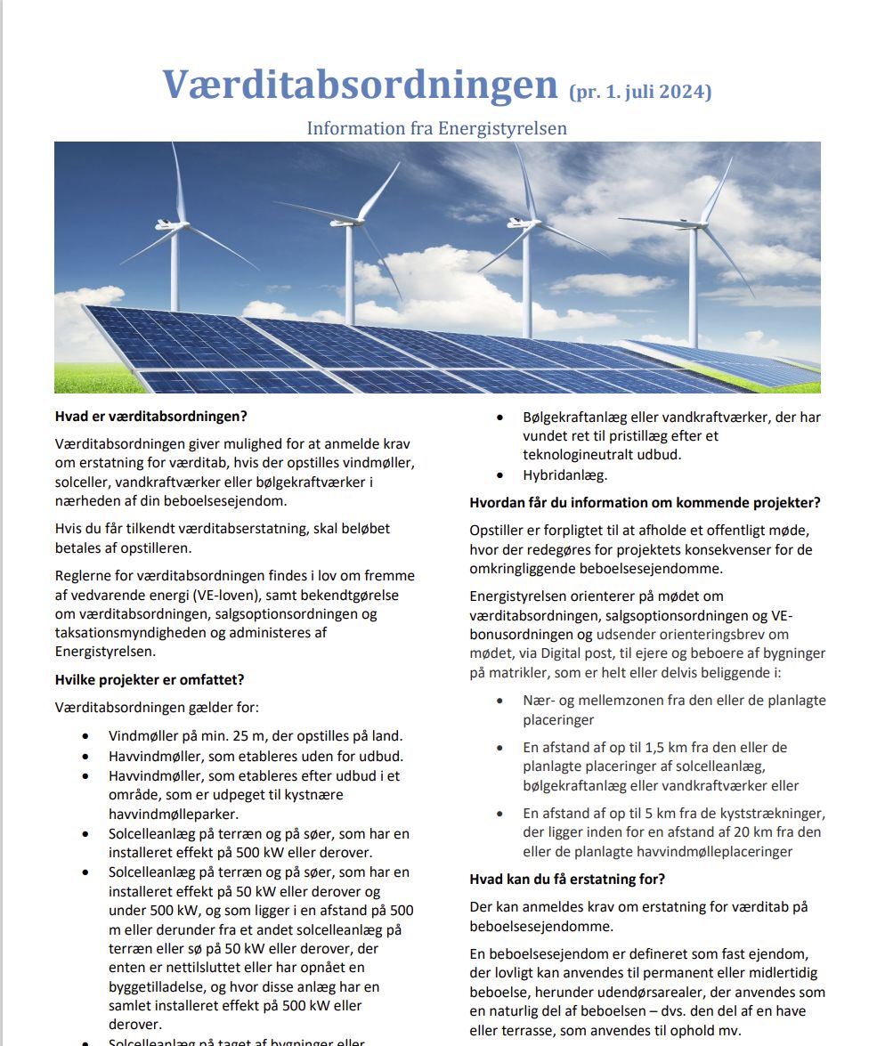 Lov om fremme af vedvarende energi (også kaldet ”VE-loven”). Reglerne for værditabsordningen findes i lov om fremme af vedvarende energi §§ 6-12 (VE-loven). Læs LBK nr. 132 af 06/02/2024 Det er Taksationsmyndigheden, som træffer afgørelse om værditab.