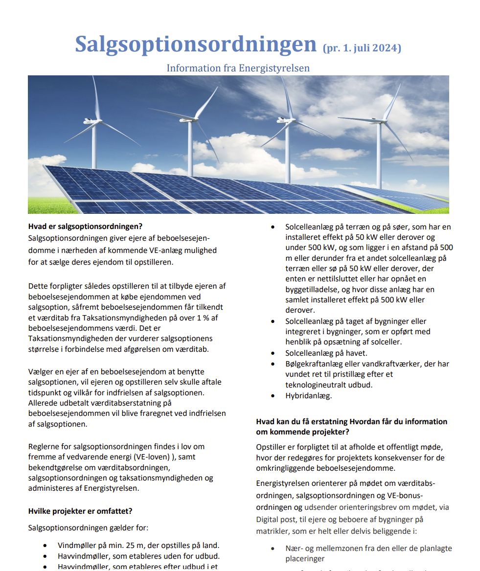 Med ændringerne indføres der blandt andet en salgsoption, der skal tilbydes til naboer til et VE-anlæg. Det vil sige, at opstiller er forpligtet til at købe naboens ejendom, såfremt ejeren heraf ønsker at sælge.