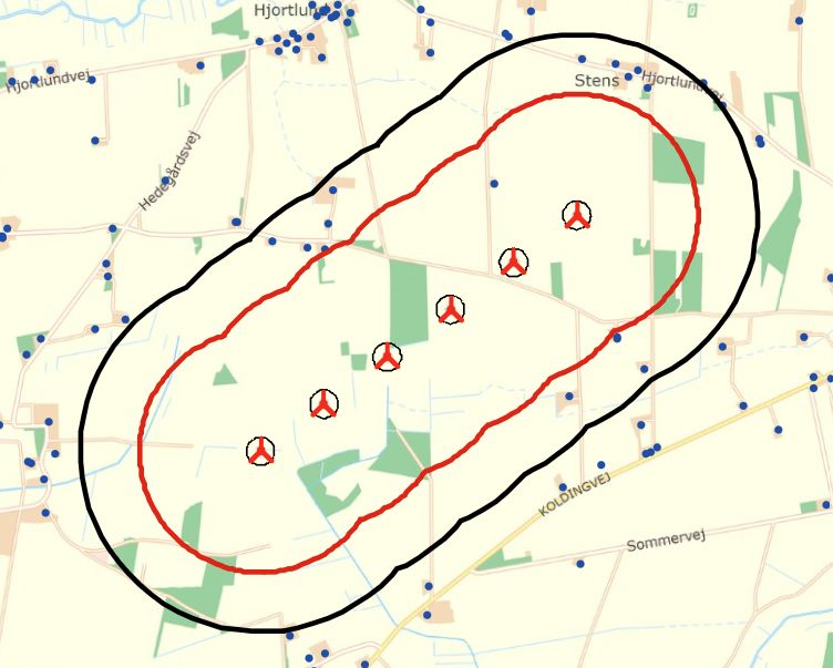 Alle boliger mellem den røde og sorte cirkel kan gratis søge værditab og salgsoption.