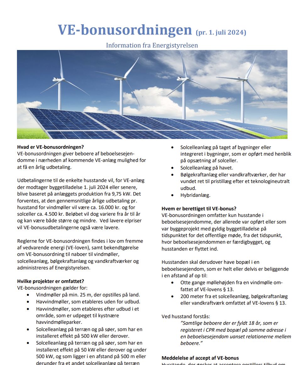 VE-bonusordningen giver beboere af beboelsesejendomme, som er beliggende i en afstand af op til 8 x vindmøllehøjden eller 200 meter fra nærmeste solcelleanlæg mulighed for at få en årlig skattefri udbetaling svarende til en del af anlæggets kapacitet i hele anlæggets levetid.